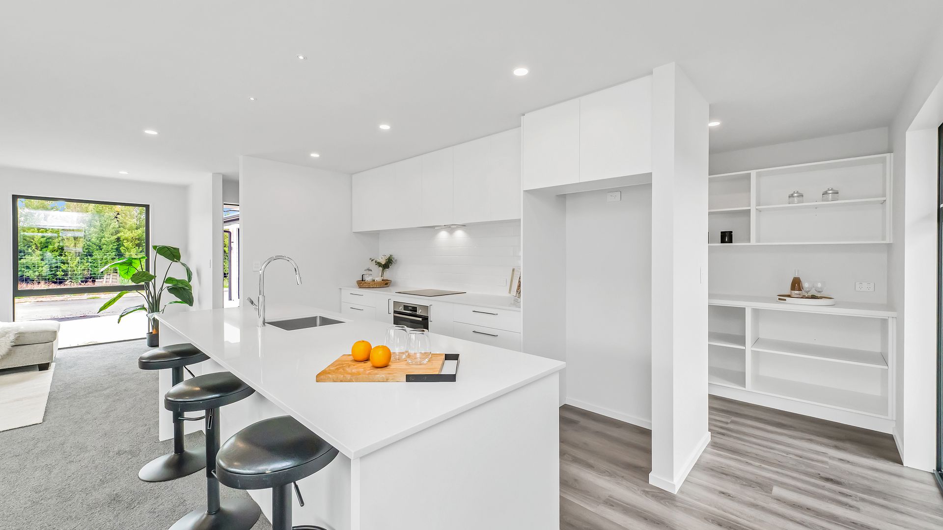 This 199m² home showcases a modern and spacious kitchen equipped with high-quality appliances, including a stone benchtop and a butler’s pantry. The kitchen seamlessly flows into a dining area and a generous open-plan living space, further enhanced by a separate lounge. It offers four well-proportioned bedrooms, two stylish bathrooms, ample storage (including a walk-in linen cupboard), a master bedroom with a walk-in wardrobe, a separate laundry, a formal entranceway, and an internal-access double garage.
