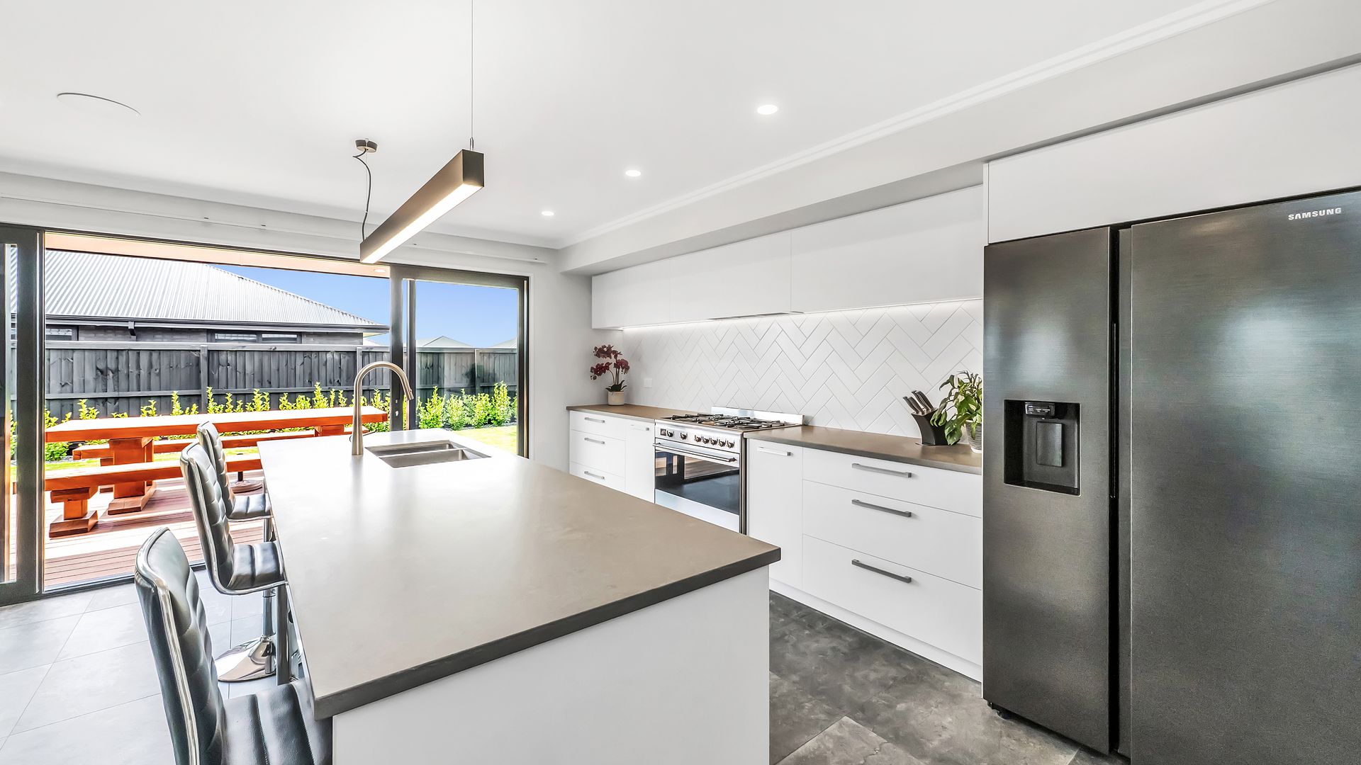 A generous entrance leads you into the heart of the home, where the open-plan kitchen, dining, and living area brings everyone together. The kitchen is both stylish and practical, featuring engineered stone benchtops, a walk-in pantry, and a 90cm gas cooktop, all overlooking the living space with its striking feature ceiling.