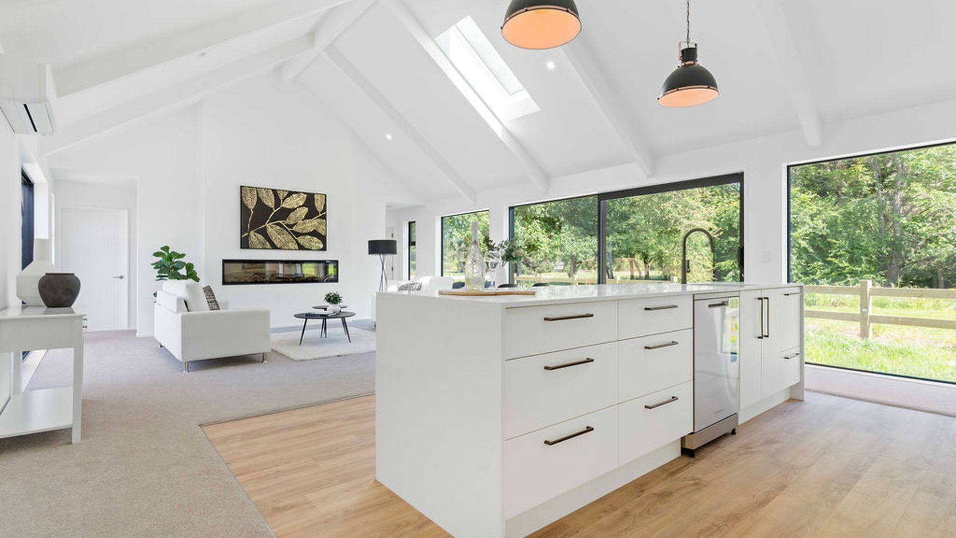 Step inside to an open-plan kitchen, dining, and living space with cathedral ceilings and excellent natural light. The kitchen is thoughtfully designed with a galley-style butler’s pantry that also incorporates laundry facilities, offering both practicality and storage.